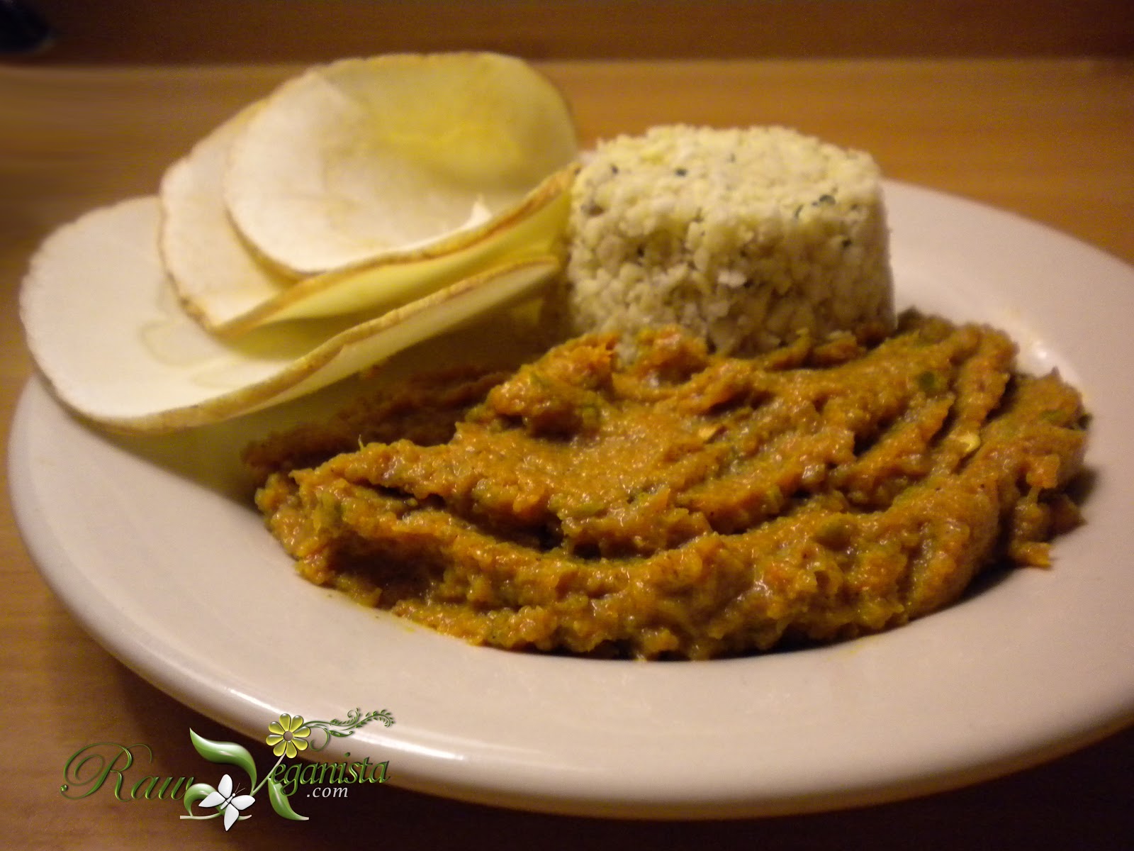 To make Autumn-spiced chili (in lieu of curry), simply omit curry spices in top portion of recipe and use powdered chili blend instead. One may also wish to create a more chili-esque texture by folding in sunflower seed “meat” or almond “taco meat” by hand after processing.