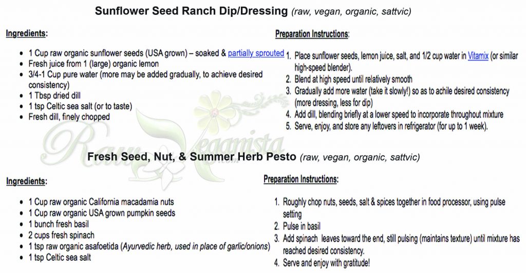 The first shared recipe is for raw, vegan, living sunflower seed ranch dip/dressing, the recipe for which I previously shared quite some time ago via this entry. As mentioned previously, the second is my most recent revision of pesto–prepared in a sattvic-friendly way.